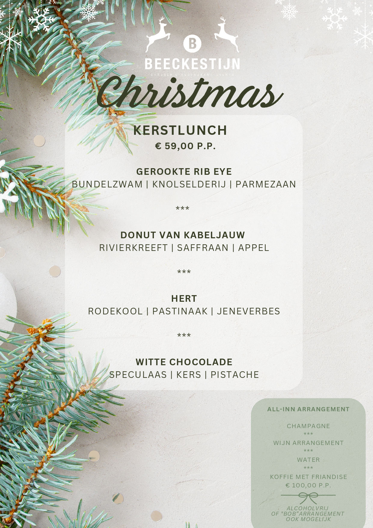 -> vergeet niet om allergieën/dieentwensen door te geven. Worden deze pas op de dag zelf doorgegeven kunnen we vanwege de drukte met feestdagen niet garanderen dat we hierop kunnen inspelen